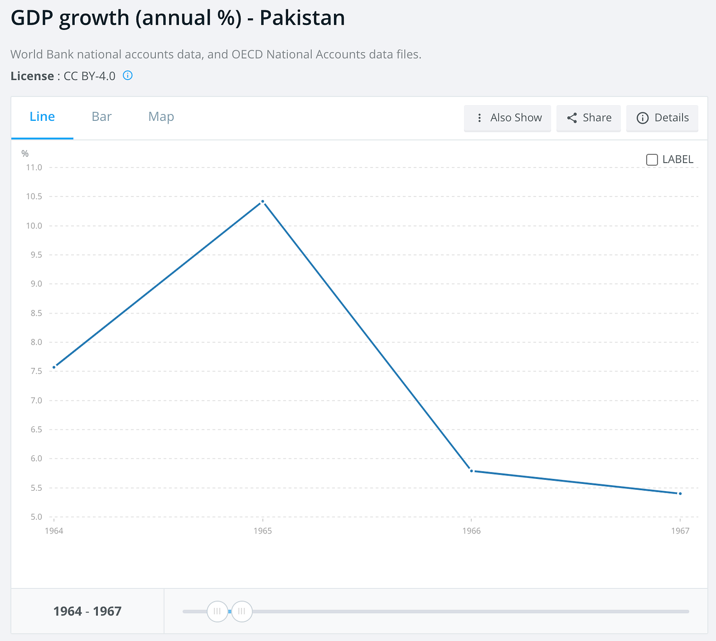 The ambiguous foreign policy stance ultimately precipitated the 1965 War with India, a neighboring rival that seized the opportunity to inflict further harm upon the nascent and fragile nation. As a consequence, an already sluggish economy bore the brunt of the conflict, exacerbating its woes. Pakistan's defense expenditure escalated from 4% to nearly 10% of the national GDP, placing additional strains on its resources. The aftermath of the war saw Pakistan depleted by 17% of its front-line strength, while India's losses amounted to less than 10%. A similar trend was observed in the national GDP graphs during that era. But a narrative of victory is largely being propagated and observed among masses to even this day. 3